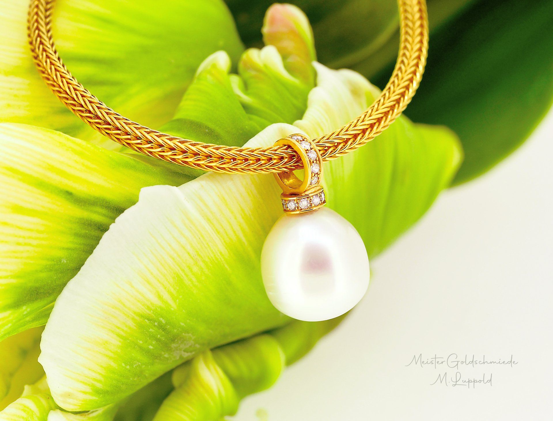 750/-Gelbgold Südseezuchtperl-Tropfen mit 26 Brillanten 0,25 ct 2.390 Euro I Foxschlauchkette 750/-Gelbgold 45 cm