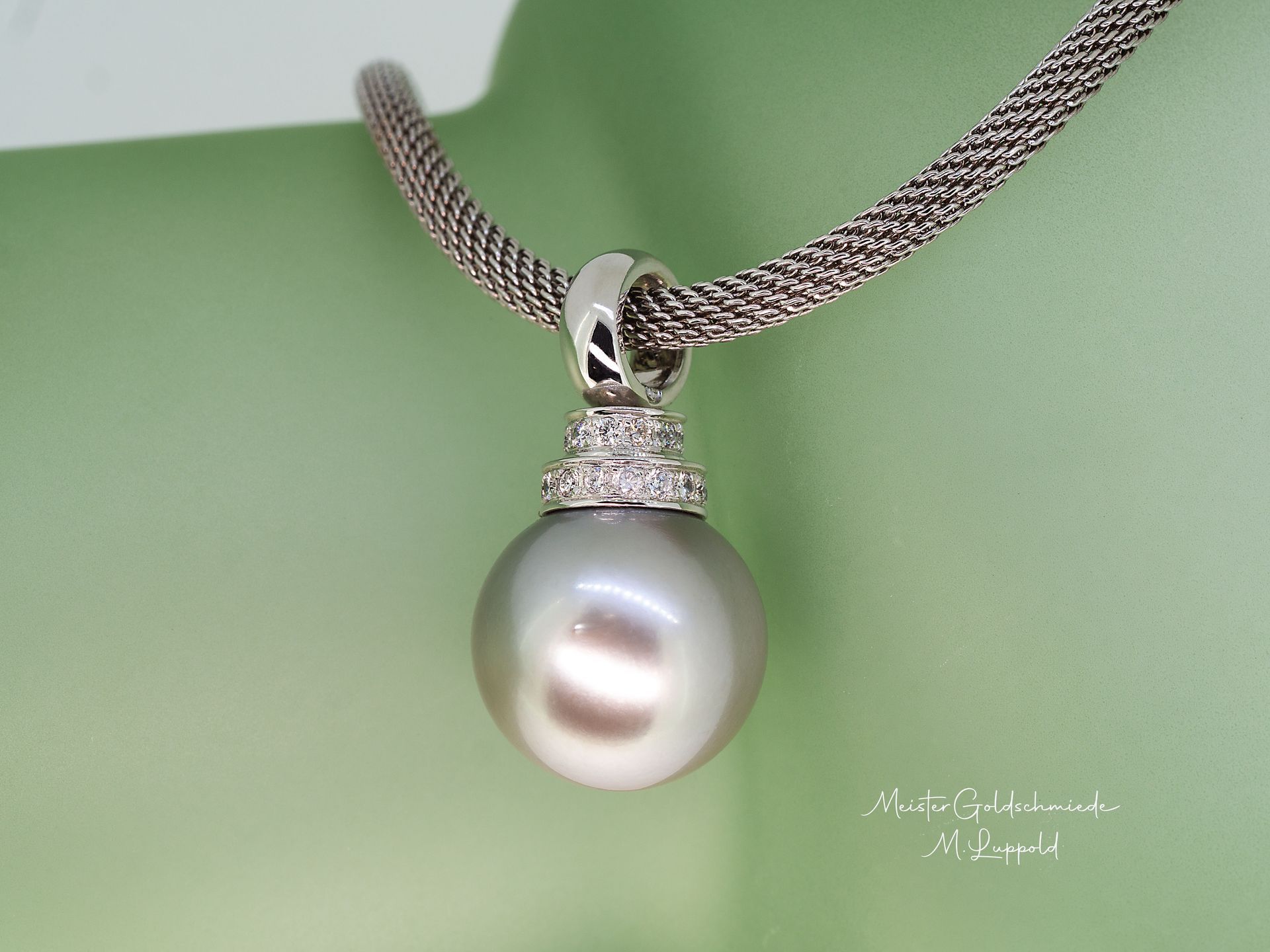 Tahitizuchtperlenkette 10-13,5 mm hellgrau mit Wechselmechanik mit und ohne Pavékugel tragbar 6.300 Euro / Pavékugel 750/- Weißgold mit 98 Brillanten 2,84 ct tw-vvs 13mm 5.300 Euro